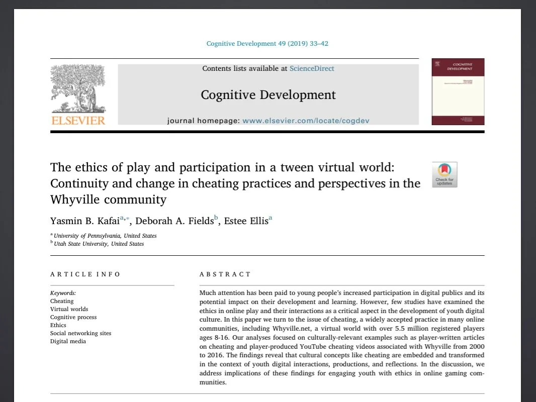 Project: Our research examined two primary areas of study: published articles in the Whyville Times and uploaded YouTube videos. We collected and analyzed cheating-related content on these platforms and evaluated various perspectives. We found a range of positive, conflicted, and condemning attitudes in the Whyville Times, and collections of Whyville scams and walk-throughs on YouTube. Users regarded different cheating behaviors with different ethical standards, in some cases more-readily sanctioning tutorials while more typically condemning scamming other players of their virtual currencies. Individual users also demonstrated diverging cheating practices over time, with some first-person accounts of remorse and reflection from past behaviors. Through both the dynamic discourse and actions analyzed in the Wyville community, cheating attitudes and practices revealed themselves to be a relevant and important topic for consideration.